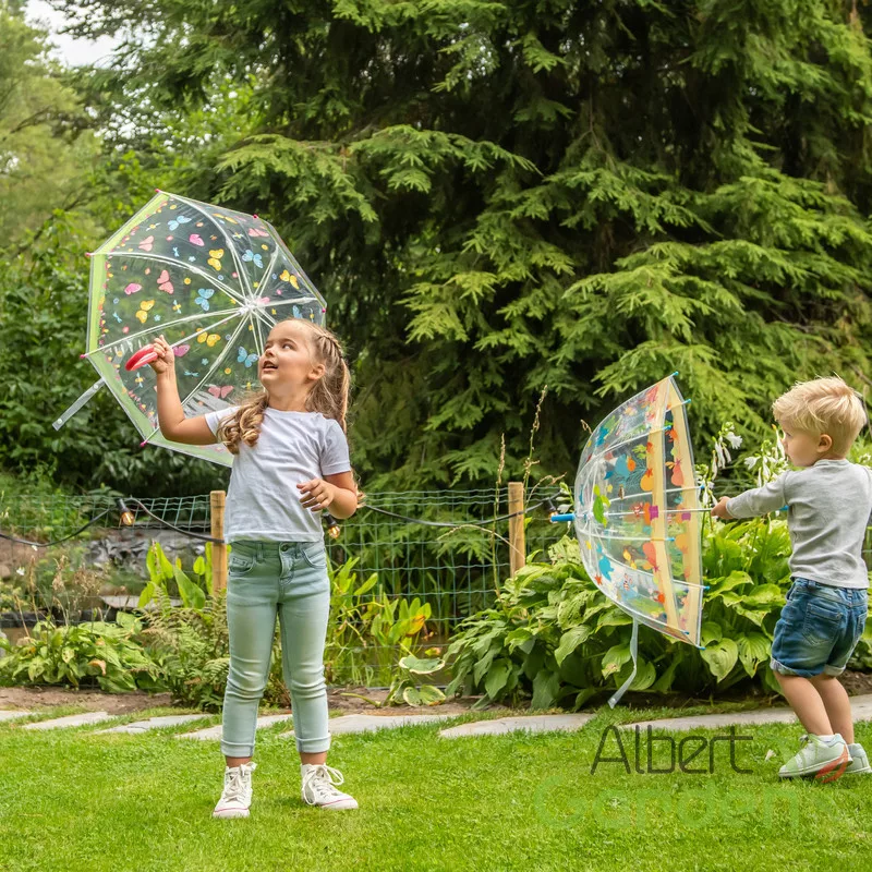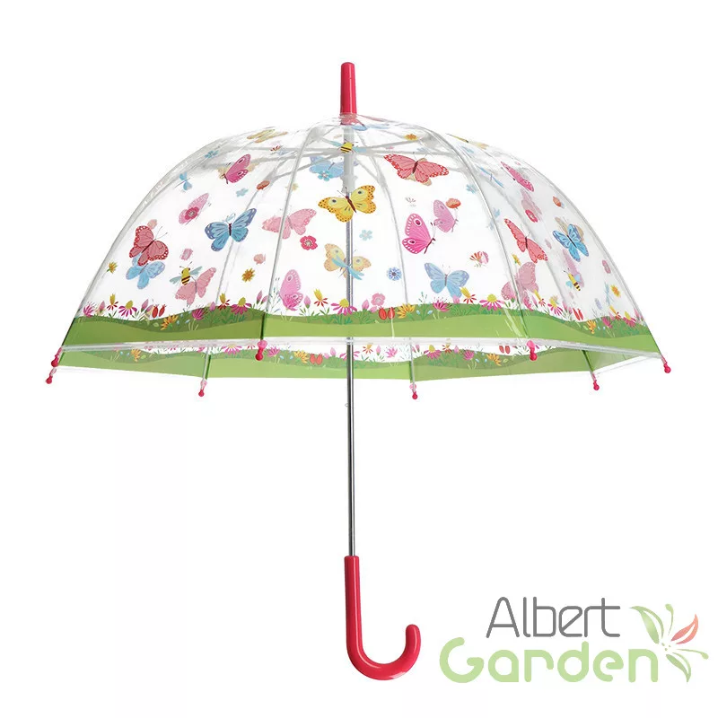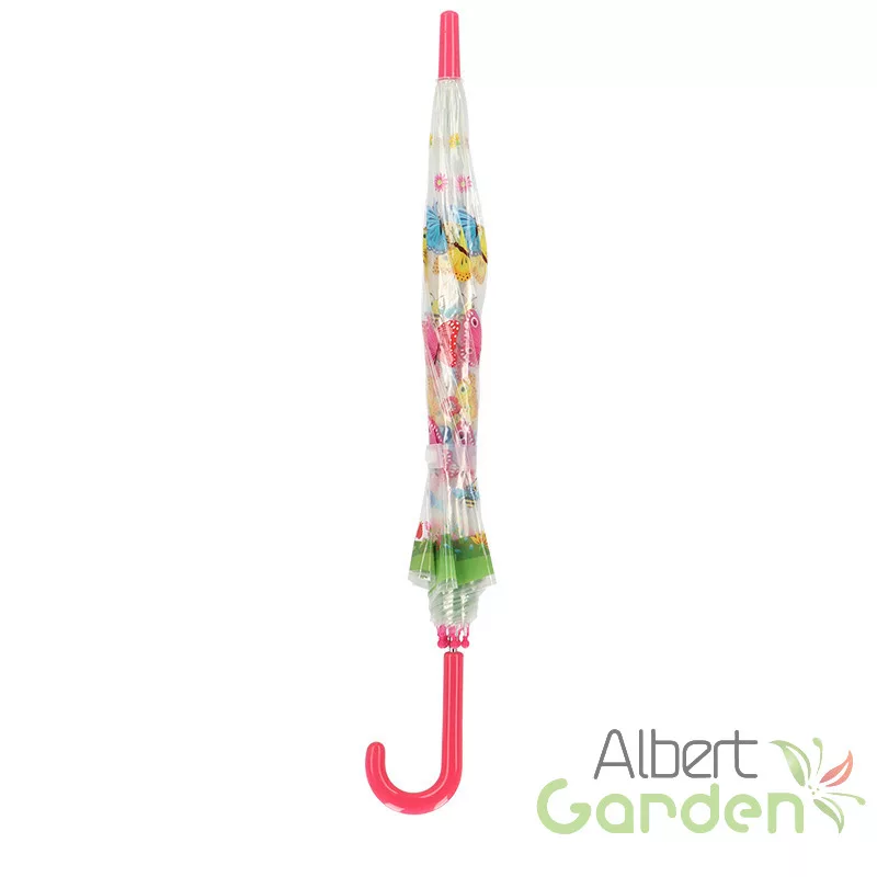 Átlátszó gyerek esernyő, pillangós mintával. Induljon vidáman minden esős nap ezentúl! Az áttetsző ernyő markolata pontosan beleillik a gyerekek kis kezébe. A lekerített alkatrészek és az áttetsző ernyő a gyermekek biztonságát szolgálják. A tarka szárnyú pillangók és a színes virágok egészen biztos mosolyt fog csalni a legkisebbek arcára is!