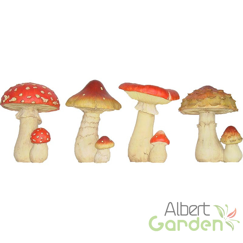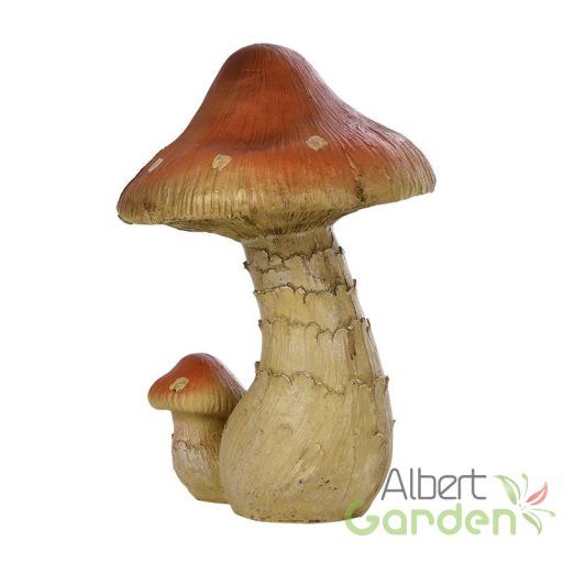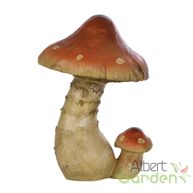 Erdei csiperke szobor egy nagyobb és kisebb gombával, M-es méretben. A szobrok festése aprólékos munkával, egytől egyig kézzel történik, így a végeredmény a megszólalásig hasonlít az eredeti növényhez. A termék anyaga polyresin, amely ellenáll a téli fagyos időjárásnak is. Mindemelett UV álló így a nyári magas UV sugárzás sem tesz kárt a termékben. Kültéren és beltéren egyaránt használható dekorációs termék. Feldobja a virágoskertet, sziklakertet és megszínesíti az erkélyt is. A lakásban stílusosan mutat az ablakpárkányokon vagy cserepes virágok földjébe helyezve.