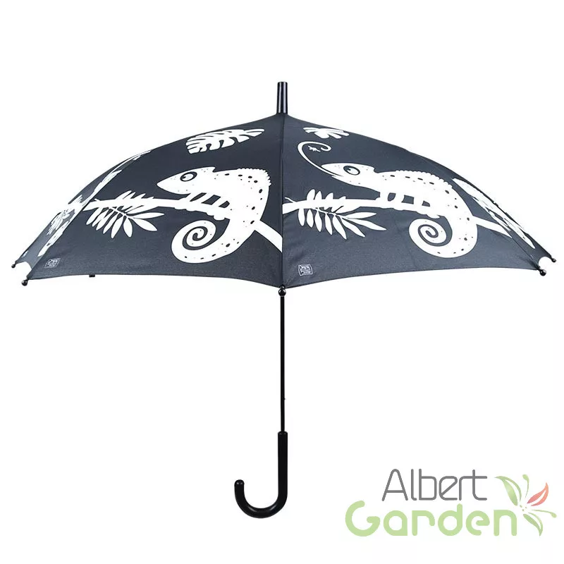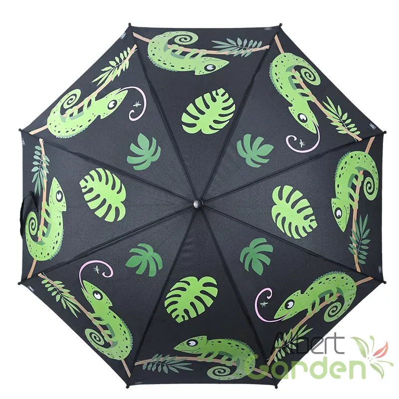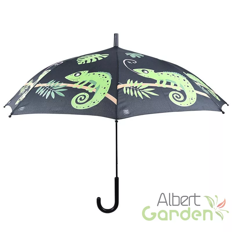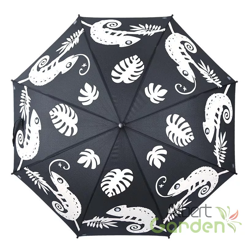 Különleges esernyő kaméleonos díszítéssel. Egyediségét színváltós tulajdonsága adja, mivel napos időben a minta fehéren marad, míg eső közben használatkor színesre vált. Ajánljuk azoknak, akik egy igazán különleges darabra vágynak. Kisebb méretéből adódóan a gyerekeknek is könnyen használható lesz.