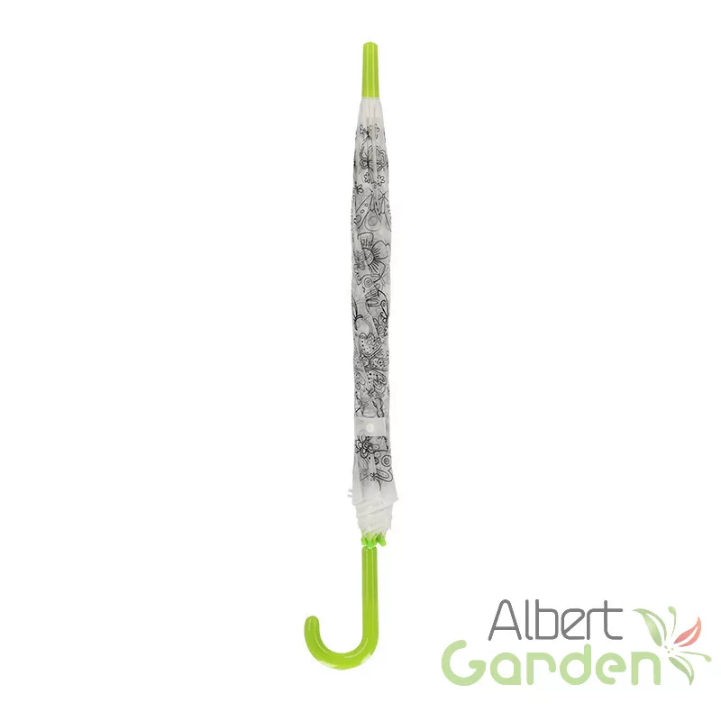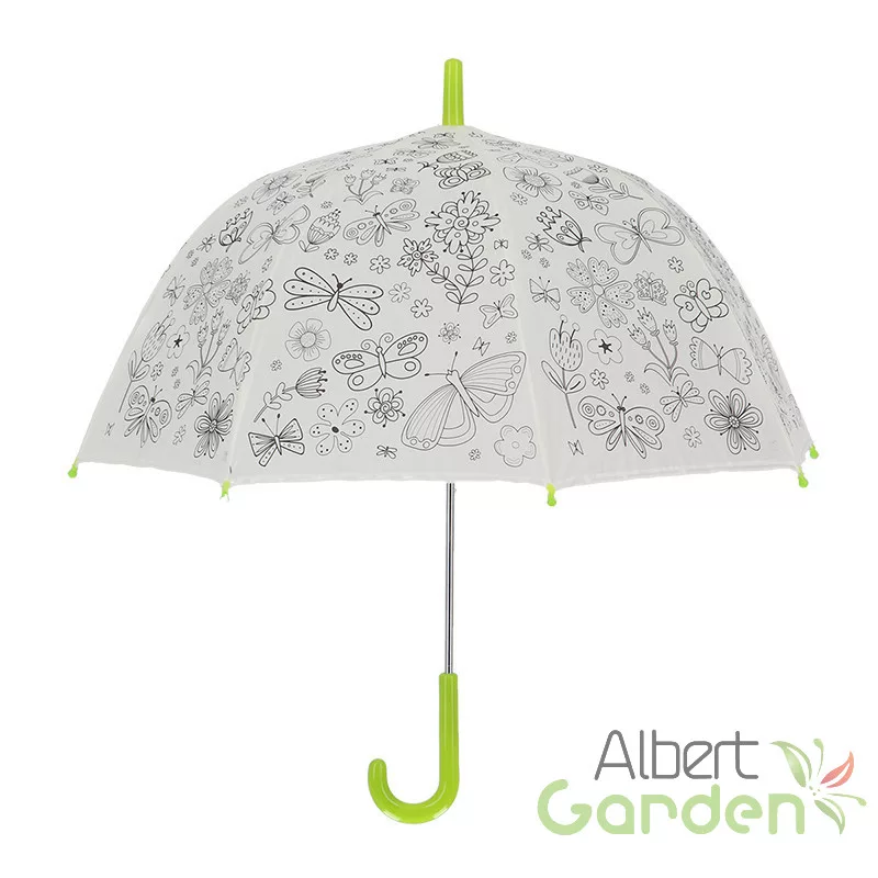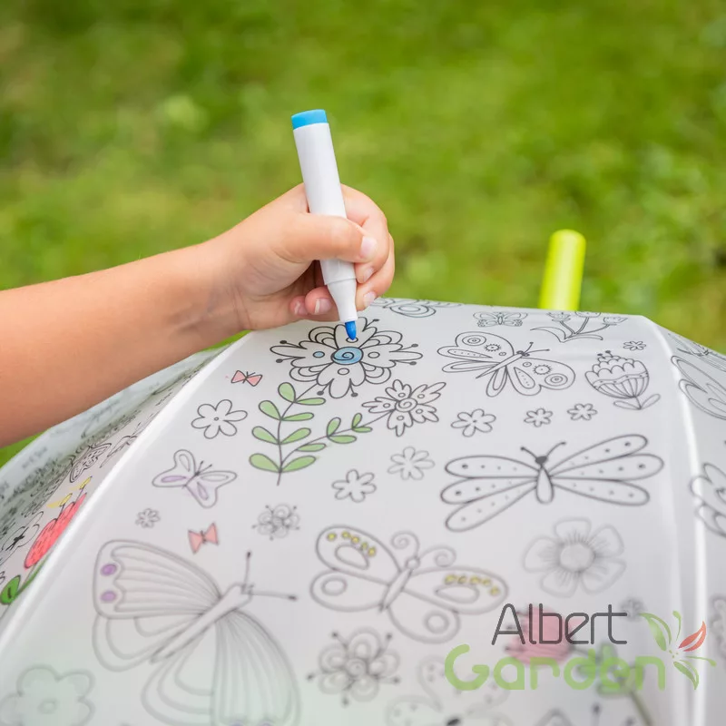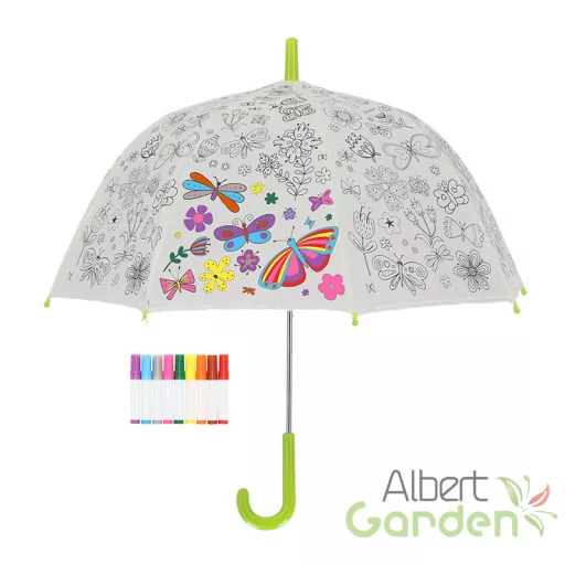 Kifesthető pillangós gyerek esernyő, filctoll készlettel. A színezhető esernyő garantált siker lesz a gyerekek körében, hiszen maguk dönthetik el, hogy a kedves pillangók szárnyai és a virágok szirmai milyen színűek legyenek! Mókás perceket és igazi kreatív időtöltést kínál ez a DIY (csináld magad) szett, melyben a gyerekméretű ernyő mellett 9 színes filctoll is található. Az esernyő markolata tökéletesen illeszkedik a kis kezekbe, használata a legkisebbek számára is biztonságos. 3 éves kortól ajánljuk.