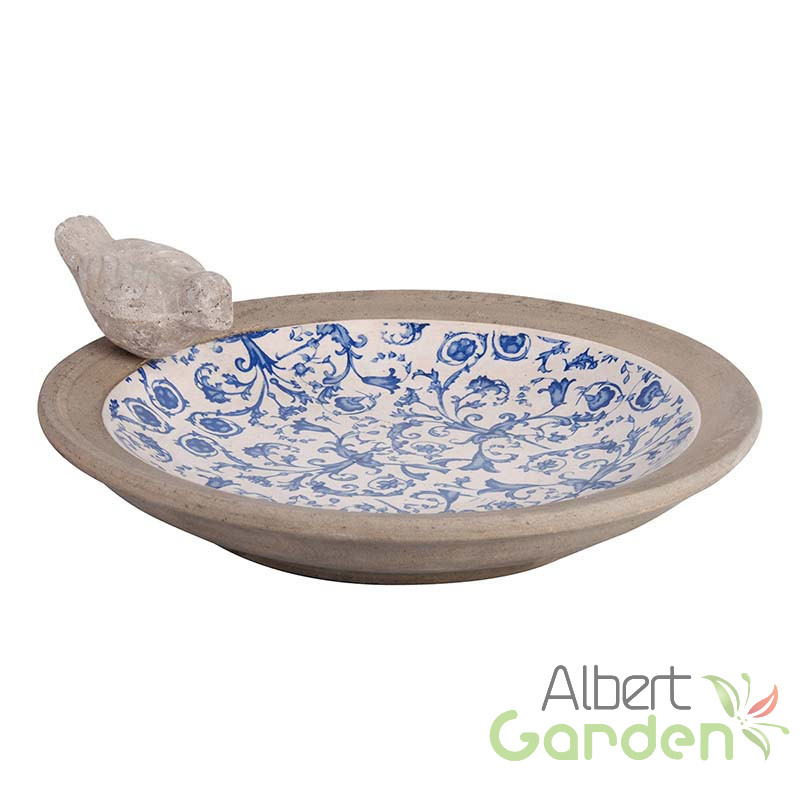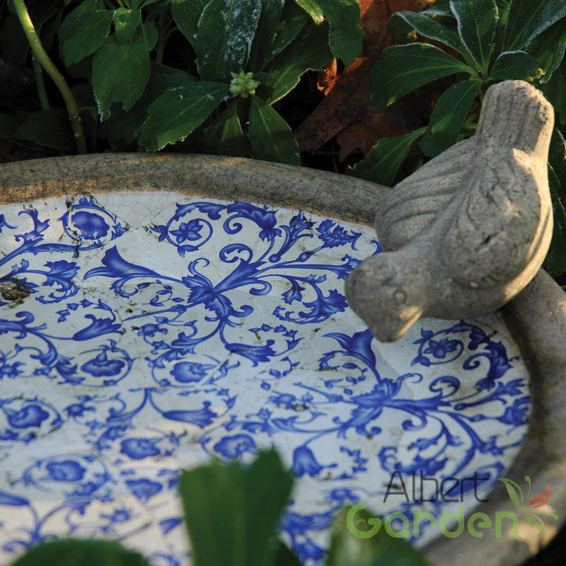 Antik hatású, kör alakú, kék-fehér kerámia madáritató és fürdető. Kertünk pompás dekorációja lehet és a madarakat is közelebb csalogatja. Az egyre szárazabb nyarakon és zordabb teleken az állatok kevesebb vizet találnak, ahol ihatnak, fürdőzhetnek és megpihenhetnek. Helyezzük el a kert különböző részein, és élvezzük a fürdőző kismadarak látványát. Anyagának köszönhetően időtálló, tisztítása egyszerű. A szürke madár dekoráció a tálból kivehető. A termék mérsékelten fagyálló.