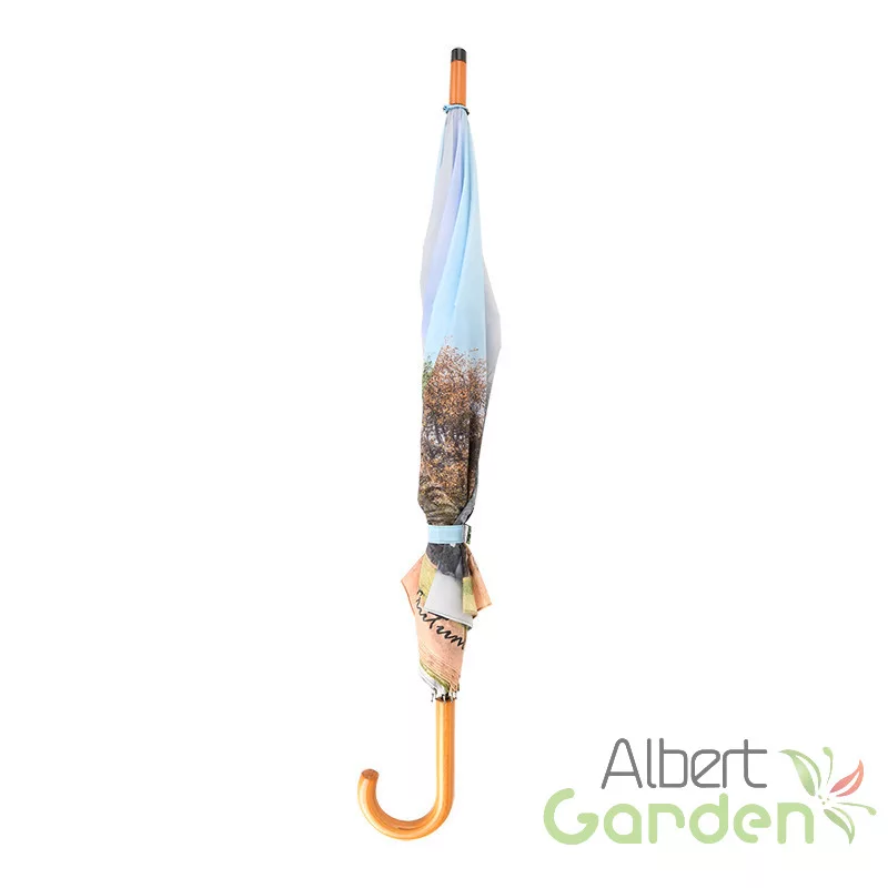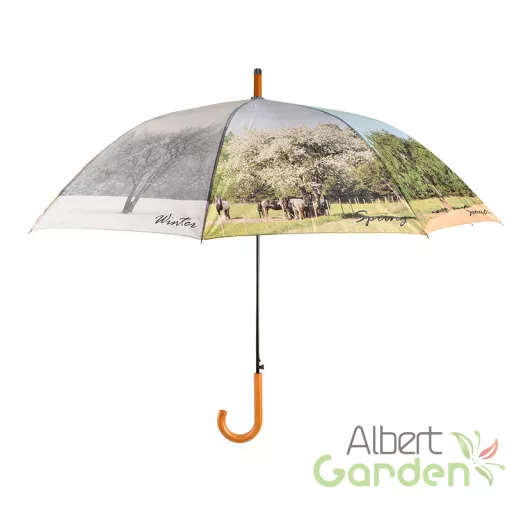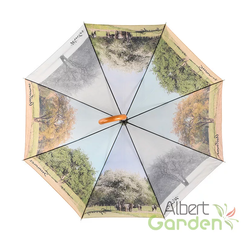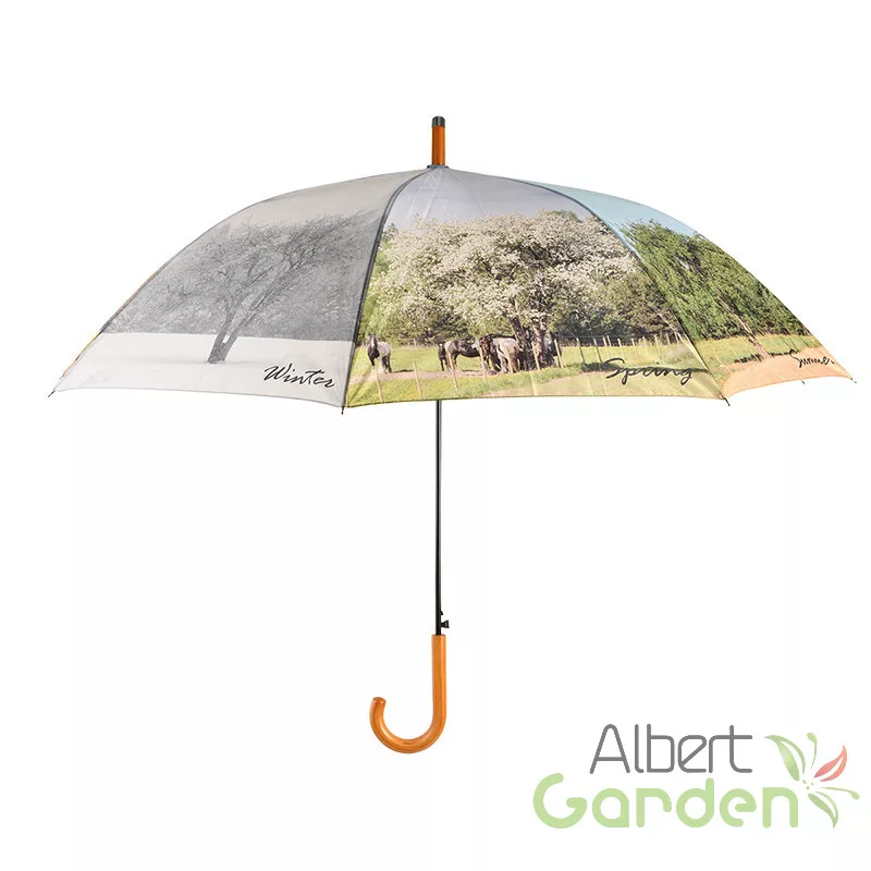 Ez a nagyméretű, 4 évszak mintával ellátott design esernyő automata nyitással működik. Vázát lakkozott, fa markolat és fekete színű fémszerkezet alkotja. Minőségi kidolgozásának köszönhetően masszív és időtálló. Az esernyőn lévő fa megtalálható a tavasz, nyár, ősz és a tél színeiben is.