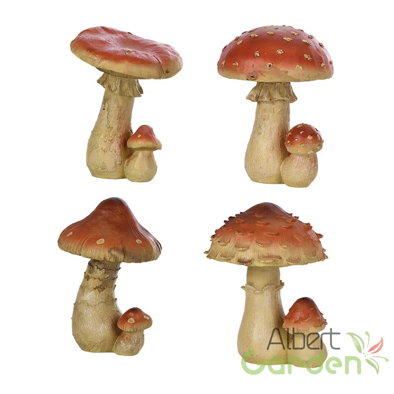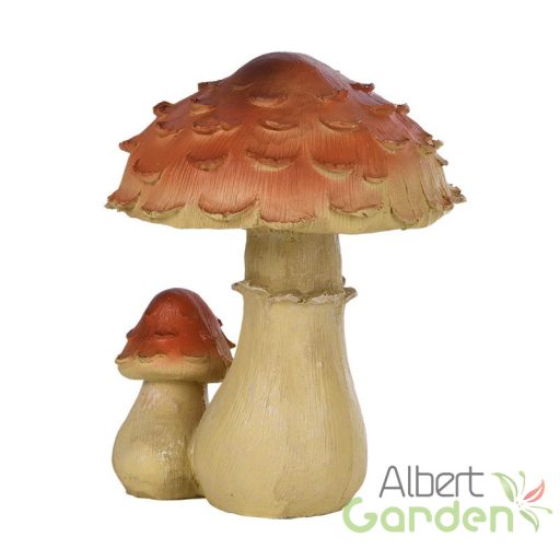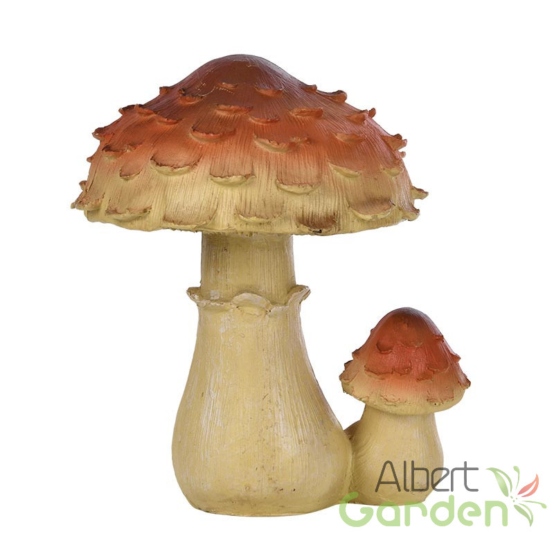 Őzlábgomba szobor egy nagyobb és kisebb gombával, L-es méretben. A szobrok festése aprólékos munkával, egytől egyig kézzel történik, így a végeredmény a megszólalásig hasonlít az eredeti növényhez. A termék anyaga polyresin, amely ellenáll a téli fagyos időjárásnak is. Mindemelett UV álló így a nyári magas UV sugárzás sem tesz kárt a termékben. Kültéren és beltéren egyaránt használható dekorációs termék. Feldobja a virágoskertet, sziklakertet és megszínesíti az erkélyt is. A lakásban stílusosan mutat az ablakpárkányokon vagy cserepes virágok földjébe helyezve.