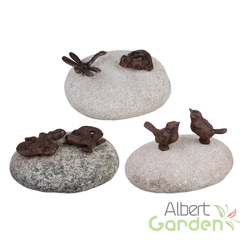 Otthonunk különleges díszítőeleme lehet ez a dekoratív, kőre erősített öntöttvas állatfigura, gyíkok formával. Remekül mutat a teraszon, az erkélyen, a kertben és a sziklakertekben megbújva egyaránt, de belső használatra is alkalmas. Engedjük el a fantáziánkat és használjuk ajtó- vagy könyvkitámasztóként! Öntöttvas jellegéből adódóan kültéri elhelyezés esetén, a korrózió megjelenésével egy patinásabb, rusztikusabb termék válik belőle.
