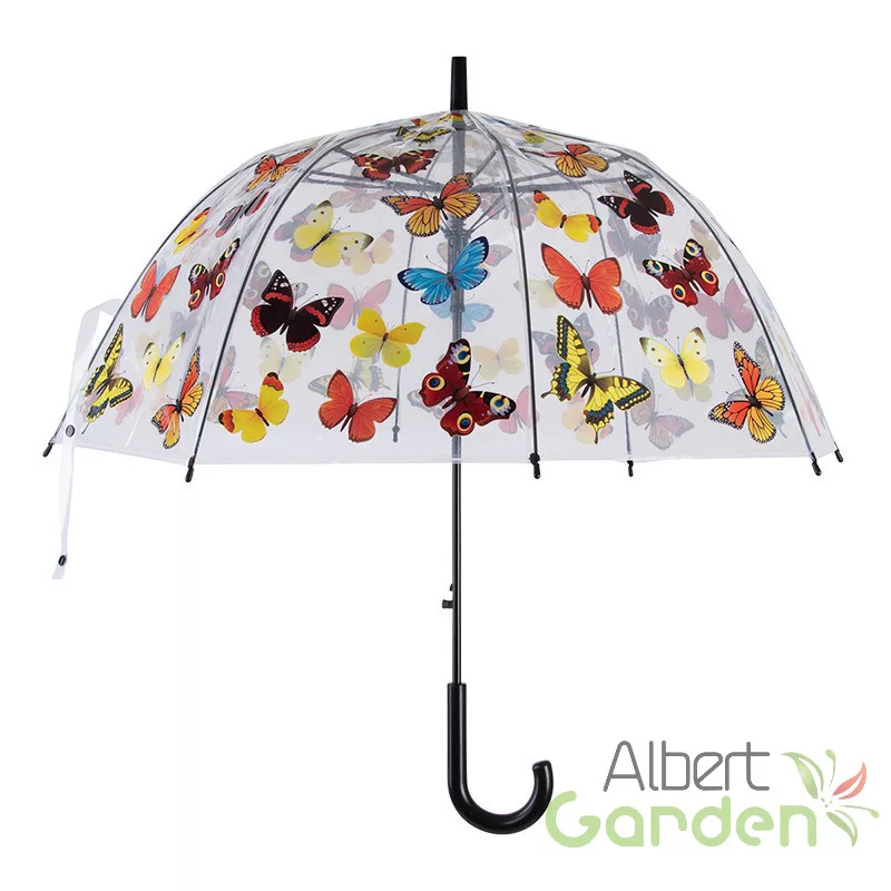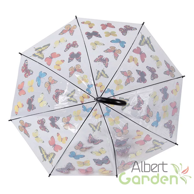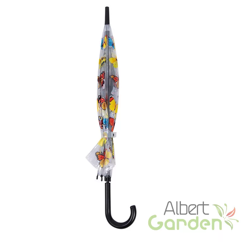 Átlátszó, pillangó mintás design esernyő automata nyitással. Váza fekete műanyag markolatból és fémszerkezetből áll. Minőségi kidolgozásának köszönhetően masszív és időtálló. Az esernyő alatt állva, 360 fokban könnyedén körbe tudunk nézni.