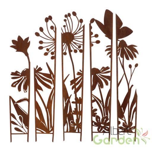 Rusztikus stílusú lézervágott fém növényfuttató, virág mintás, 117 cm, 5 db-os szett