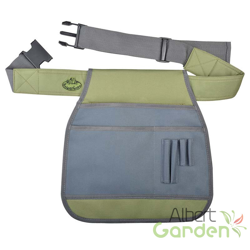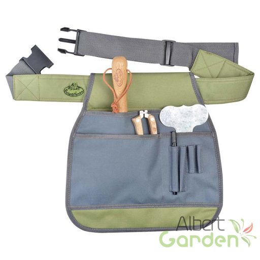 Kerti szerszámos övtáska, divatos zöld-szürke színben, hímzéssel. Nagy zsebeinek köszönhetően többféle szerszám tárolására is alkalmas, állítható övrészének köszönhetően saját méretünknek megfelelően beállíthatjuk. Kiváló ajándék ötlet a kertészet szerelmeseinek. Az övtáskát szerszámok nélkül szállítjuk.