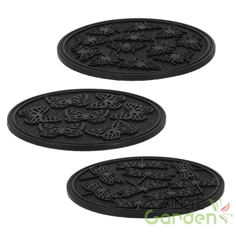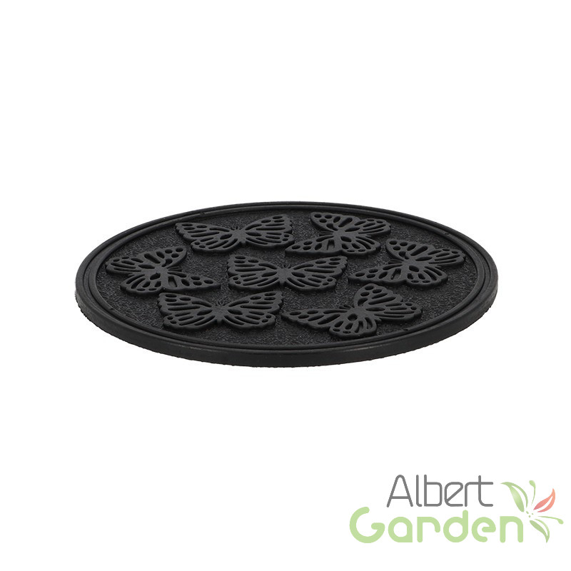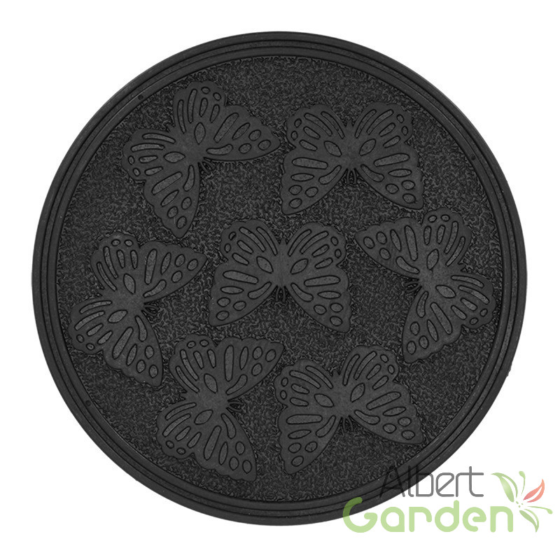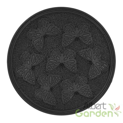 Újrahasznosított gumiból készült lépőkő, pillangós mintával, 30 cm-es átmérővel. A dekoratív lépőkőnek köszönhetően mindig száraz és tiszta marad a cipőd a kertben, és biztonságosan kertészkedhetsz anélkül, hogy a véletlen megsértenéd a földből frissen előbújt hajtásokat. A mintás, domború felület a csúszásmentességről is gondoskodik. Akár kerti ösvényt is kialakíthatsz a gyepen, a veteményesben vagy a virágoskertben, ha több darabot helyezel el egymás után sorban.