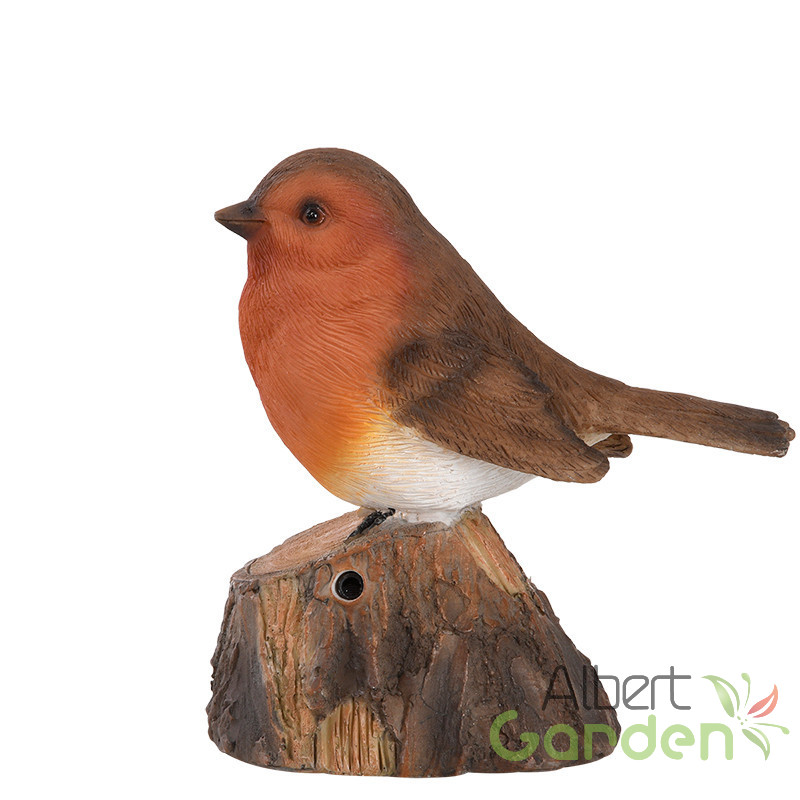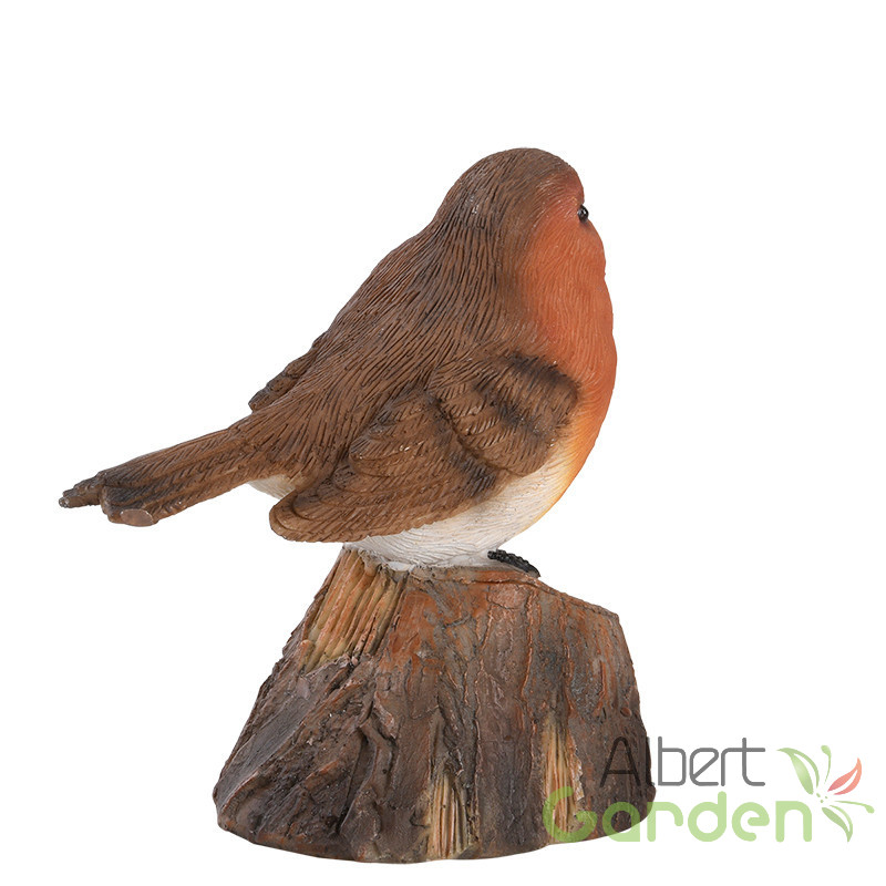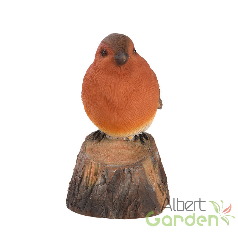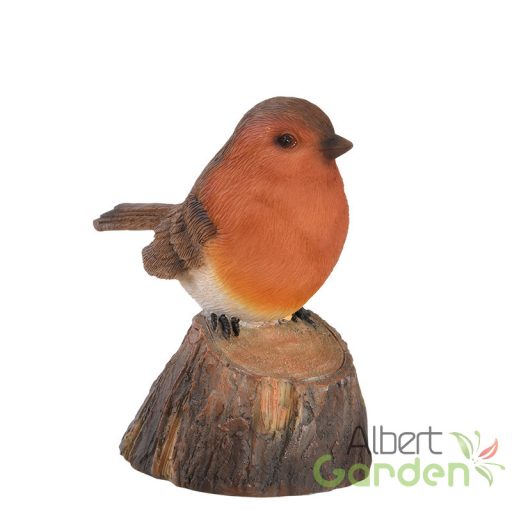 Fatörzsön ülő csiripelő kismadár polyresin szobor, vörösbegy, kültéri és beltéri dekorációs kiegészítő